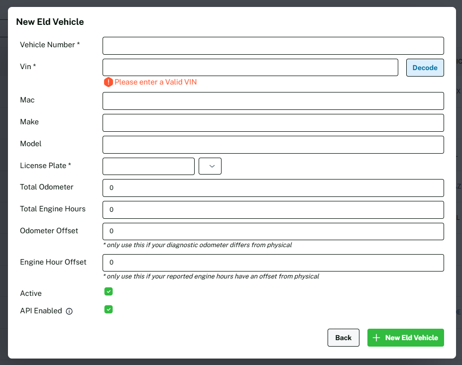 Step 4: Save the vehicle info by clicking the New Eld Vehicle button in the bottom right corner.