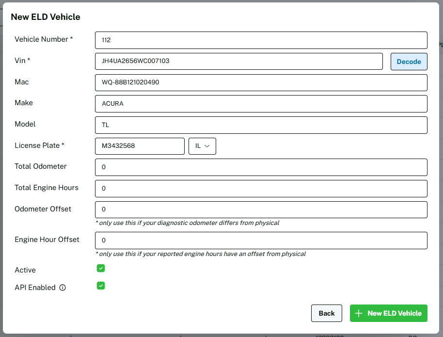 Every data entered in Update Eld Vehicle is saved by clicking on Update Eld Vehicle.